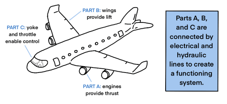 A system is composed of different elements that are designed to interact with one another to achieve a purpose that cannot be achieved by the elements alone. For example, a commercial aircraft is composed of many parts that are designed to work together to achieve its purpose of transporting goods and people. The body of the aircraft (called fuselage) is designed to provide the structure to hold the engine, wings, fuel tanks, cargo, landing gear etc. While each of these elements provide a specific function (e.g., engine provides thrust), all of these elements work together to safely move and fly the aircraft and its occupants.