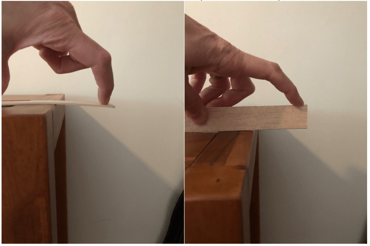 Let’s do an experiment. From your balsa wood sheets, cut a rectangle. I made mine 5 in (12.7 cm) long and 1 in (2.5 cm) wide. Hold it over the edge of a table with the wide side down, like a miniature diving board, and push on the end. Then rotate it 90 degrees so the narrow side is down. Push on the end. Which way bends more? Why?