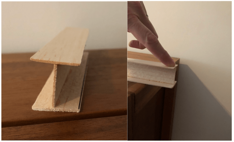 The real key here is that moment of inertia benefits from having as much area as possible as far as possible from the centroidal axis. If you have taken calculus, you can see this mathematically by calculating the moment of inertia as Ix=∫y2dA. An experimental way to see this is to build an I-beam. Cut two more balsawood planks matching the one you made previously, then glue the three planks together to make an I shape. Repeat your same experiment, hanging the beam off the side of a table and applying a force.