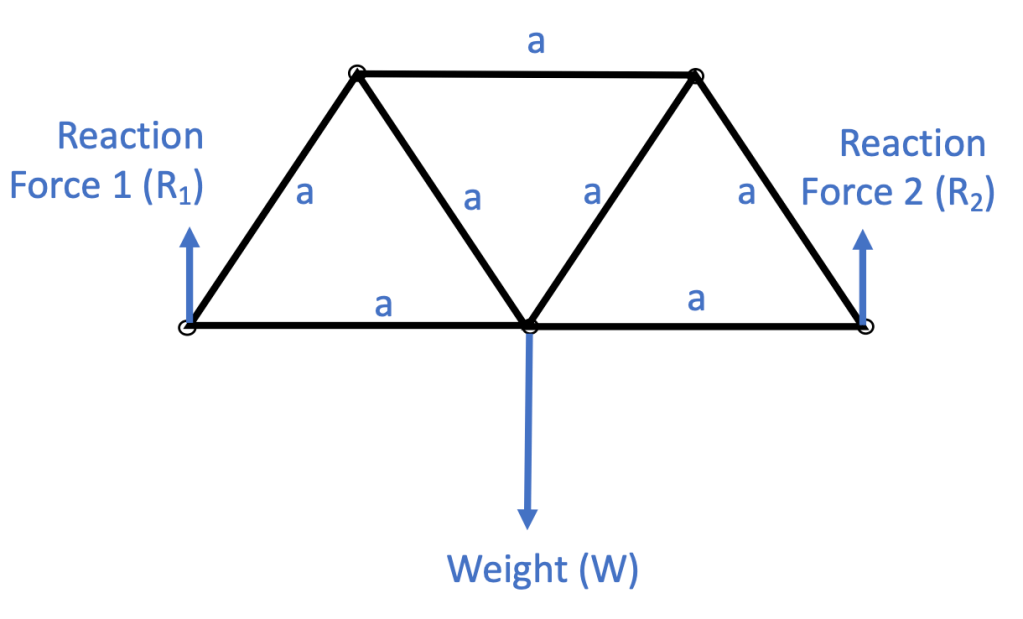 If you added weight at the bottom center node of the truss, do you know how to calculate the reaction forces (R) at the ends? If you’re unsure how to do this, start by drawing a free body diagram of your bridge with the weight (W) added. Then, we can use what we know of forces and moments to solve. For example, a free body diagram of your bridge, with the added weight, might look something like this, where R1 and R2 are reaction forces at the ends, and a is the length of each truss member. The circles in the diagram are nodes where the members are joined together with pins.