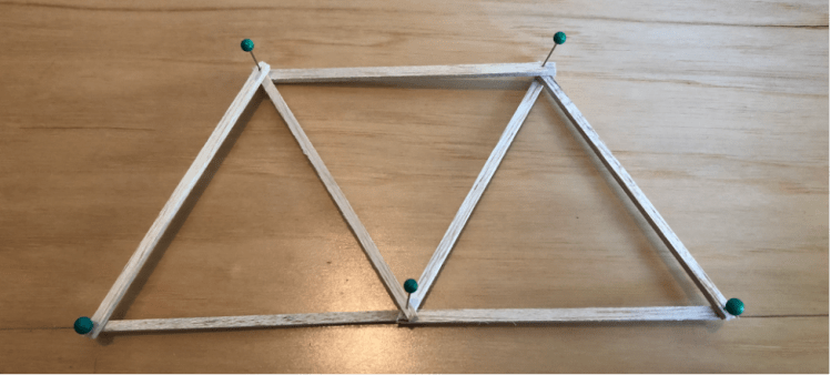 Have you ever built a bridge out of toothpicks, straws, or balsa wood? That was a truss – an assembly that uses beams and simple connections, often leveraging triangular geometries, to make a remarkably strong structure. Trusses are all around you, in your attic, holding up bridges, and supporting vehicle structures. Get the balsa wood sticks and pins from your BLIMP kit, we are going to build a truss. Let’s start with making two equilateral triangles – recall an equilateral triangle has the same length on all sides. I measured and cut 4-inch (~10 cm) segments of balsa wood and pinned them together like so: