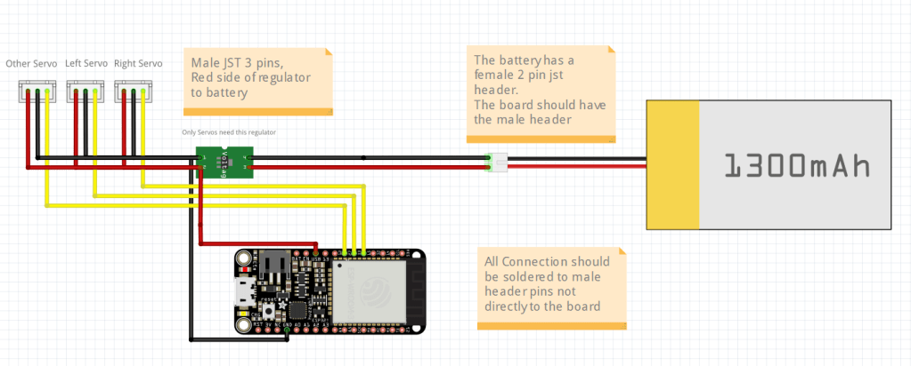 - Use the above diagram to identify which JST Connectors is for the servos (should be the ones connected on its own to the Voltage Regulator).
