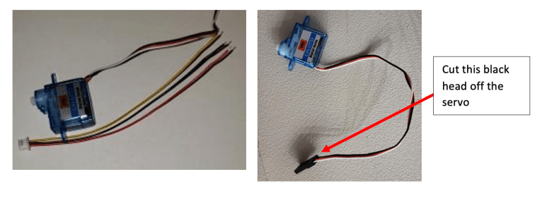 - Remove 3 servos from your kit, and cut off the black header attached to the servo (see picture below). Then attach a female JST connector to the servo connecting the wires Red to Red, White to Yellow, and Black to Black. As in the previous steps, strip 1 cm of plastic off the ends of the wires, twist wires together, apply solder, then cover with electrical tape.