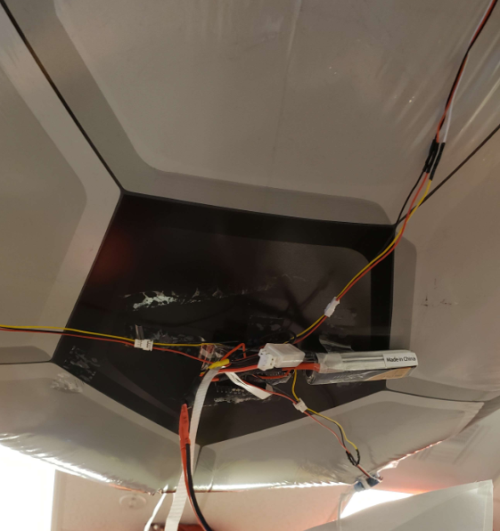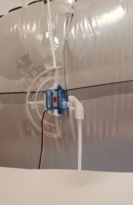 - Add the servos to where the structure ends on the balloon, and place the remaining electronics below the large balloon.