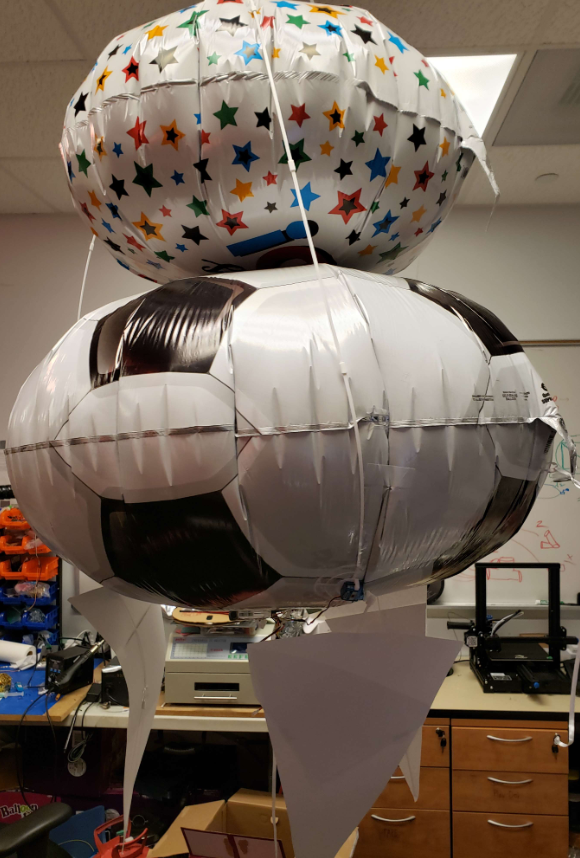 - Add the fins to where the structure ends on the balloon, and place the remaining electronics below the large balloon.