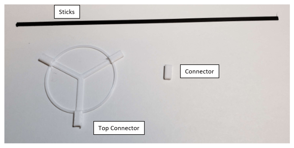 - Please grab all the Sticks, Top Connector, and Connectors. Then with a small amount of glue begin to assemble the outside struct by inserting the sticks into the holes of the connectors starting from the top connector. Do so by adding 4 sticks to the three sides of the top connector.
