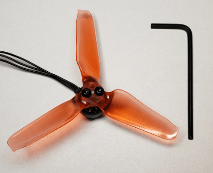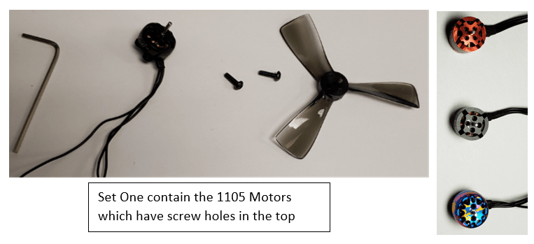 - Screw in the Propellers – push the propeller onto the motor, line up propeller and motor holes, and then use hex screws to attach it.