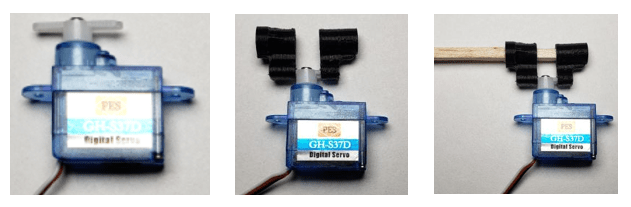 - Screw the pieces together using a black screw from the servo bag. Attach the servo to the servo holder with a second black screw.