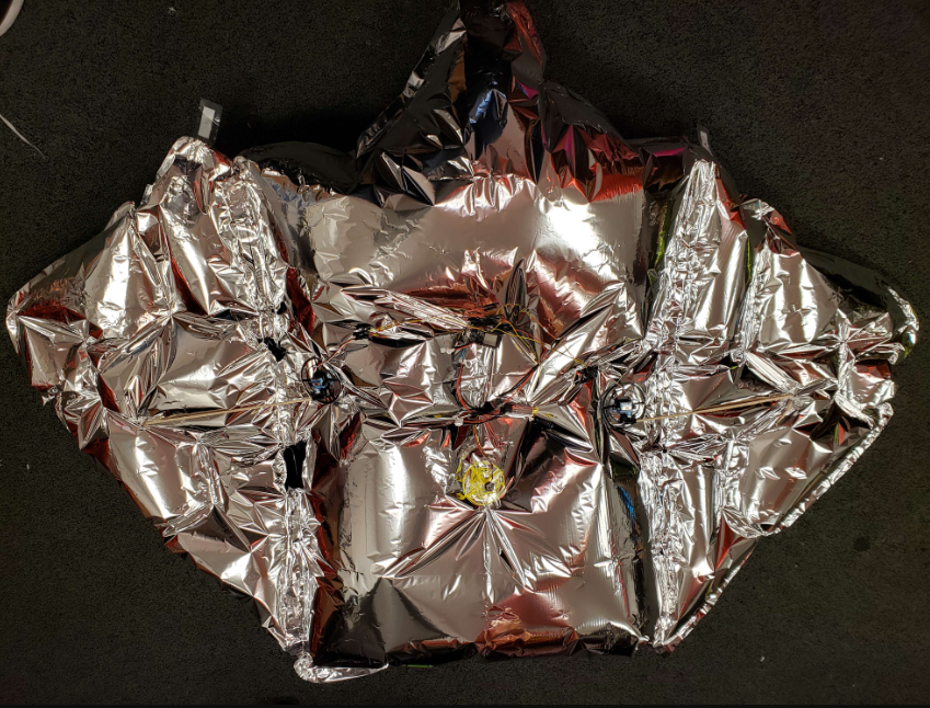 - Attach the Feather, battery, and motor to the bottom of the center balloon. Then attach the servo mount to the bottom aligned with where the balsa wood stick will be taped to the wing.